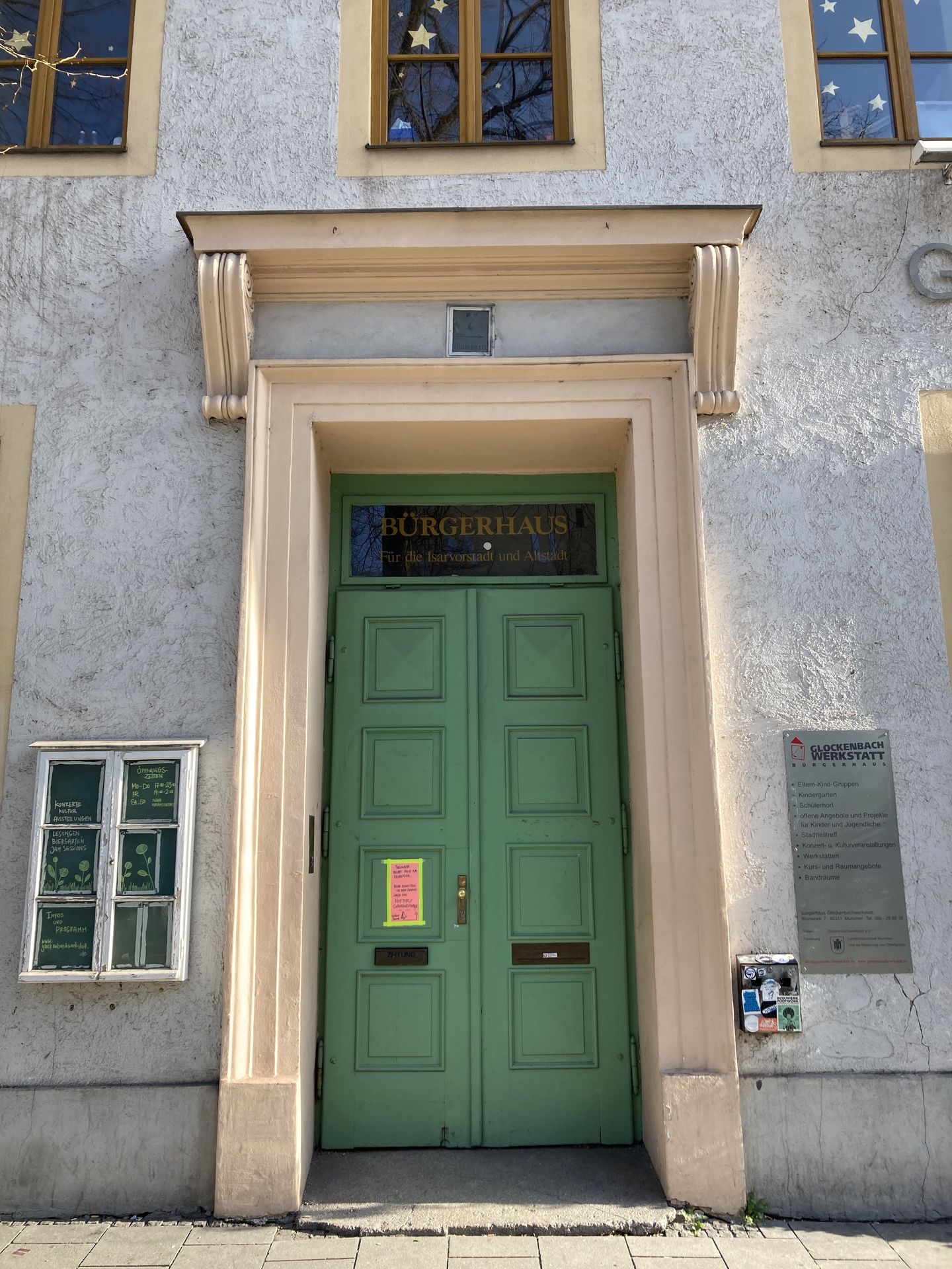 --> Wir treffen uns in der Glockenbachwerkstatt. Die große grüne Eingangstür ist offen. Dann geht ihr die Treppe hoch, in den ersten Stock. Das Teamzimmer findet ihr rechts.