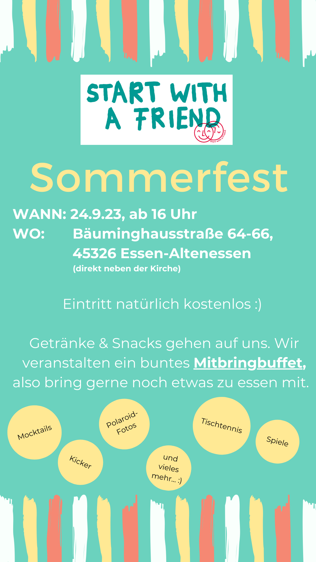 Eintritt ist kostenlos. Getränke & Snacks gehen auf uns. Bring aber gerne noch Deinen Lieblingssalat, Kuchen oder etwas anderes mit! 🍰