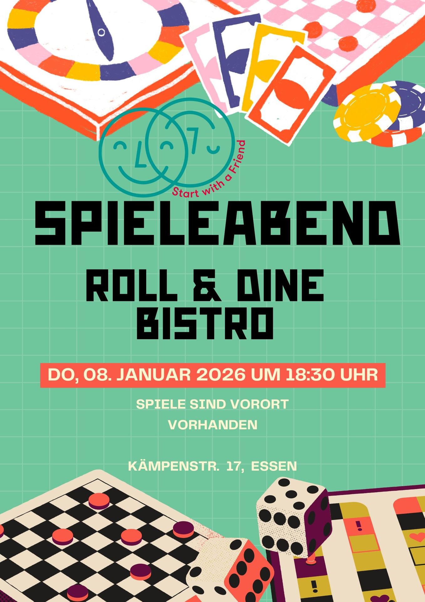 Zum Auftakt ins neue Jahr laden wir euch herzlich zu unserem Spieleabend im Roll & Dine ein. Lasst uns gemeinsam in gemütlicher Runde einen tollen Abend voller Karten- und Würfelspiele genießen. Schöne Gespräche und Austausch wird es natürlich auch geben 😉